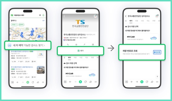 네이버 예약 기능도 각종 식당 예약만 되는 게 아니고, 이제는 자동차검사 예약도 지원한다고 해요. 네이버 앱 또는 네이버 모바일 웹에서 ‘자동차 검사’나 ‘자동차검사 예약’을 검색하면, 똑같이 교통안전공단 시스템과 연결되어 예약 서비스를 제공하는 화면이 나온다고 해요.